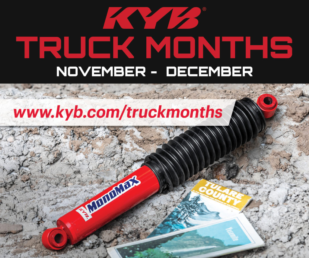 KYB’s popular, “Truck Months” promotion returns this winter. Running November and December, “Truck Months” offers rewards for both Service Providers and consumers who install KYB shocks, struts or assemblies on trucks, and SUVs. Restoring designed vehicle control, or adding increased handling and control capabilities, KYB offers a range of products for trucks and SUVs.